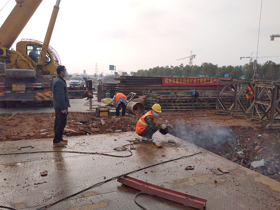 嚴(yán)抓復(fù)工后的疫情防控工作。圖為2020年2月24日樟樹葛玄路臺(tái)埠中橋便道鋼便橋施工現(xiàn)場(chǎng)